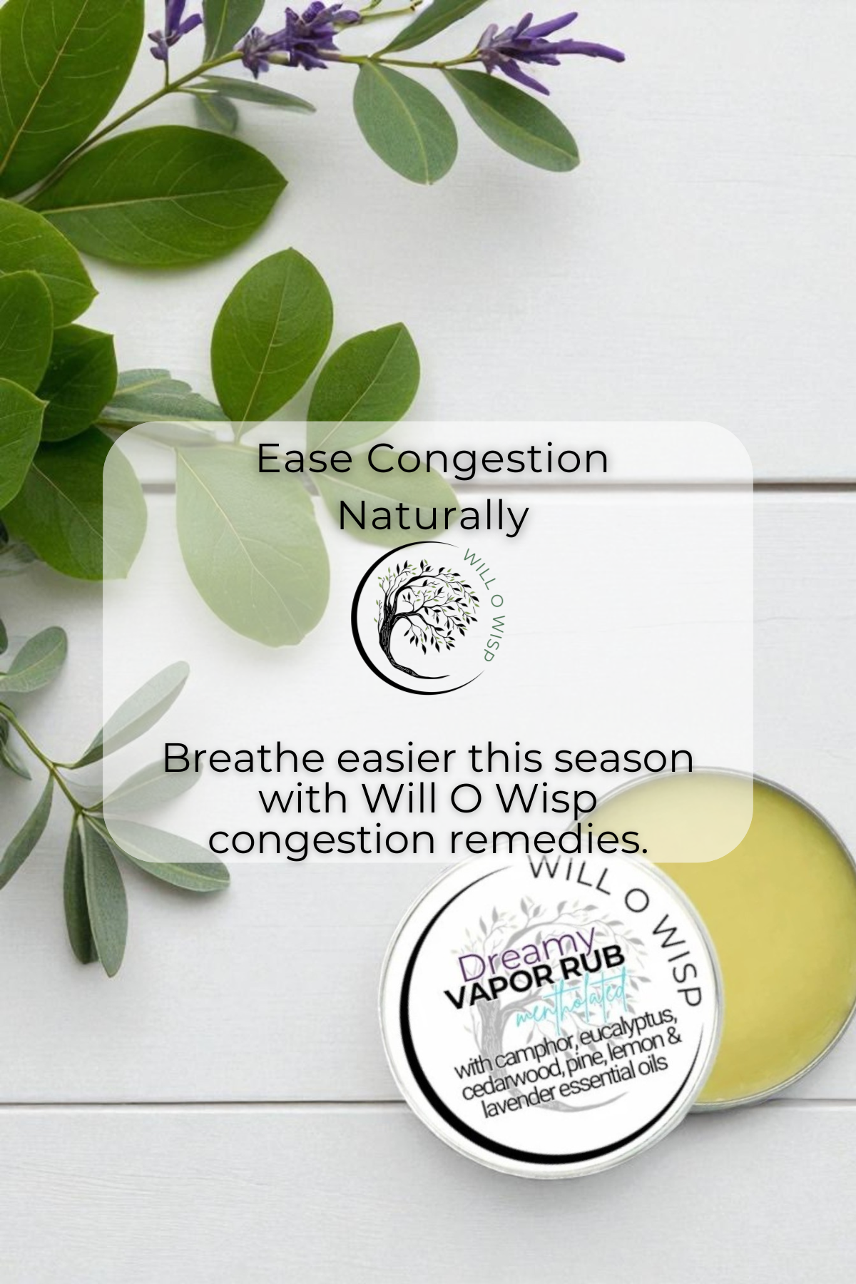 Breathe easier this season with Will O Wisp congestion remedies. Crafted with pure essential oils and cooling menthol, our Vapor Rub, Vapor Wisp Nasal Inhalers, and Aromatherapy Shower Steamers open airways and bring instant comfort without harsh chemicals.