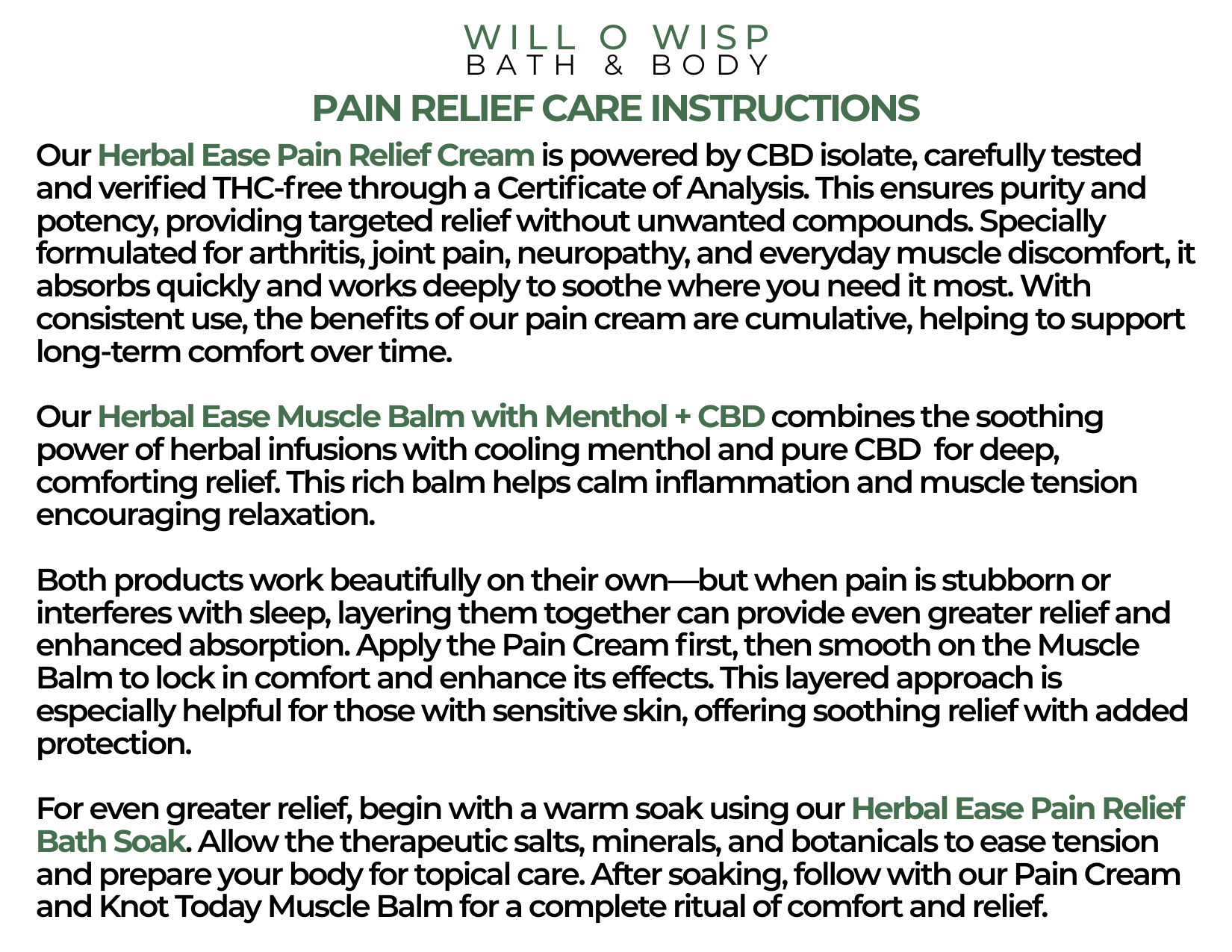 ✔ For stubborn pain or flare-ups, begin with a warm soak using our Herbal Ease Bath Soak, then follow with the Pain Relief Cream and Herbal Ease Muscle Balm to complete your ritual of relief.