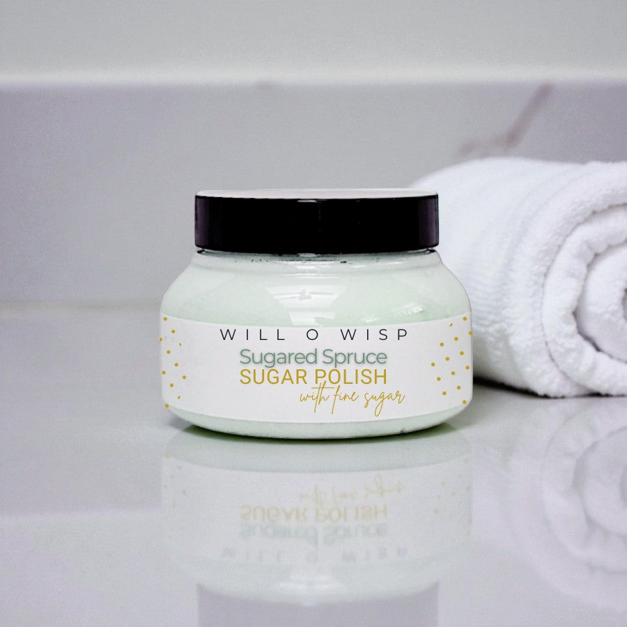 Indulge your skin with the soft, creamy texture of Will O Wisp Sugar Polish — a rich, conditioning body exfoliant that gently buffs away dryness while leaving skin silky, smooth, and radiant. Crafted with fine sugar crystals, velvety plant butters, and nourishing oils, each polish melts into a decadent cream that hydrates as it exfoliates.